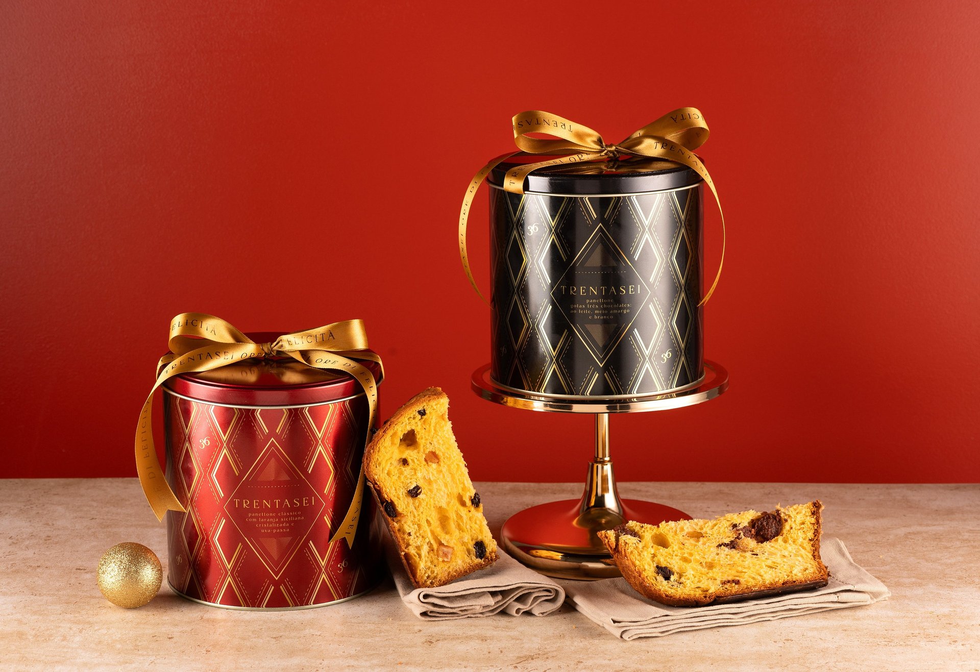 Laranjas cristalizadas da Sicília, com frescor cítrico e delicado. Uvas passas importadas, doces e equilibradas, escolhidas com rigor. Blend de chocolates importados, feito de cacau fino de aroma, entre os mais raros do mundo. Farinha italiana, que garante estrutura e pureza à massa. Manteiga francesa, com sabor pleno e aveludado.